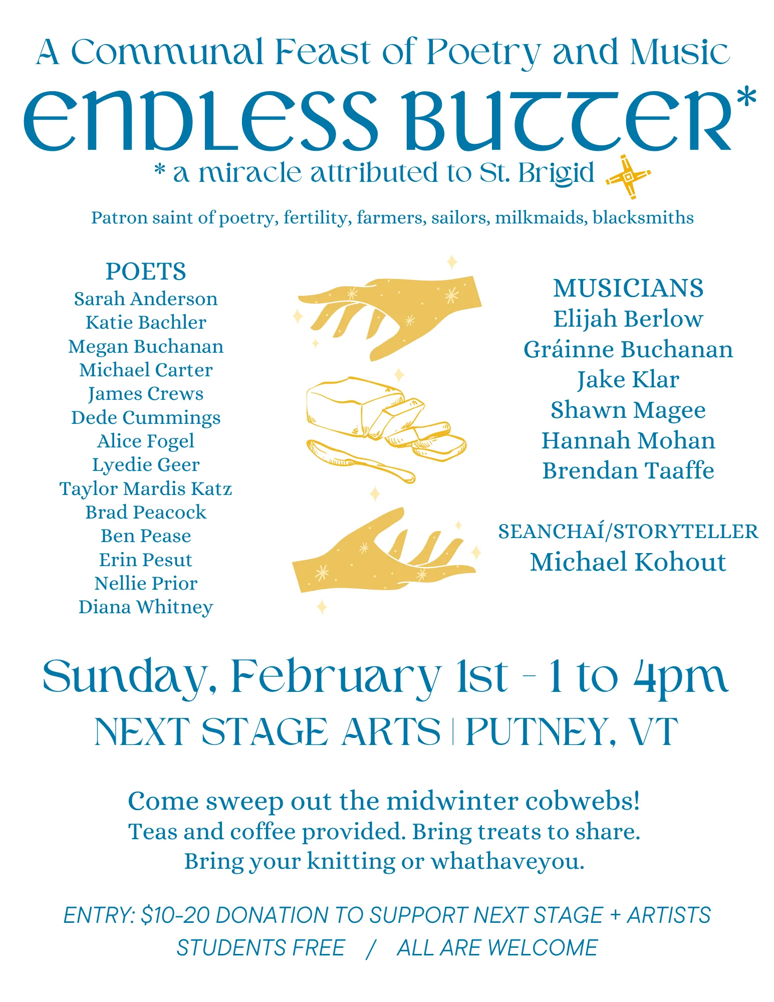 Endless Butter: A Communal Feast of Poetry and MusicCelebrate midwinter with a warm gathering of poetry, music, and storytelling! Featuring poets Sarah Anderson, Katie Bachler, Megan Buchanan, Michael Carter, James Crews, Dede Cummings, Alice Fogel, Lyedie…