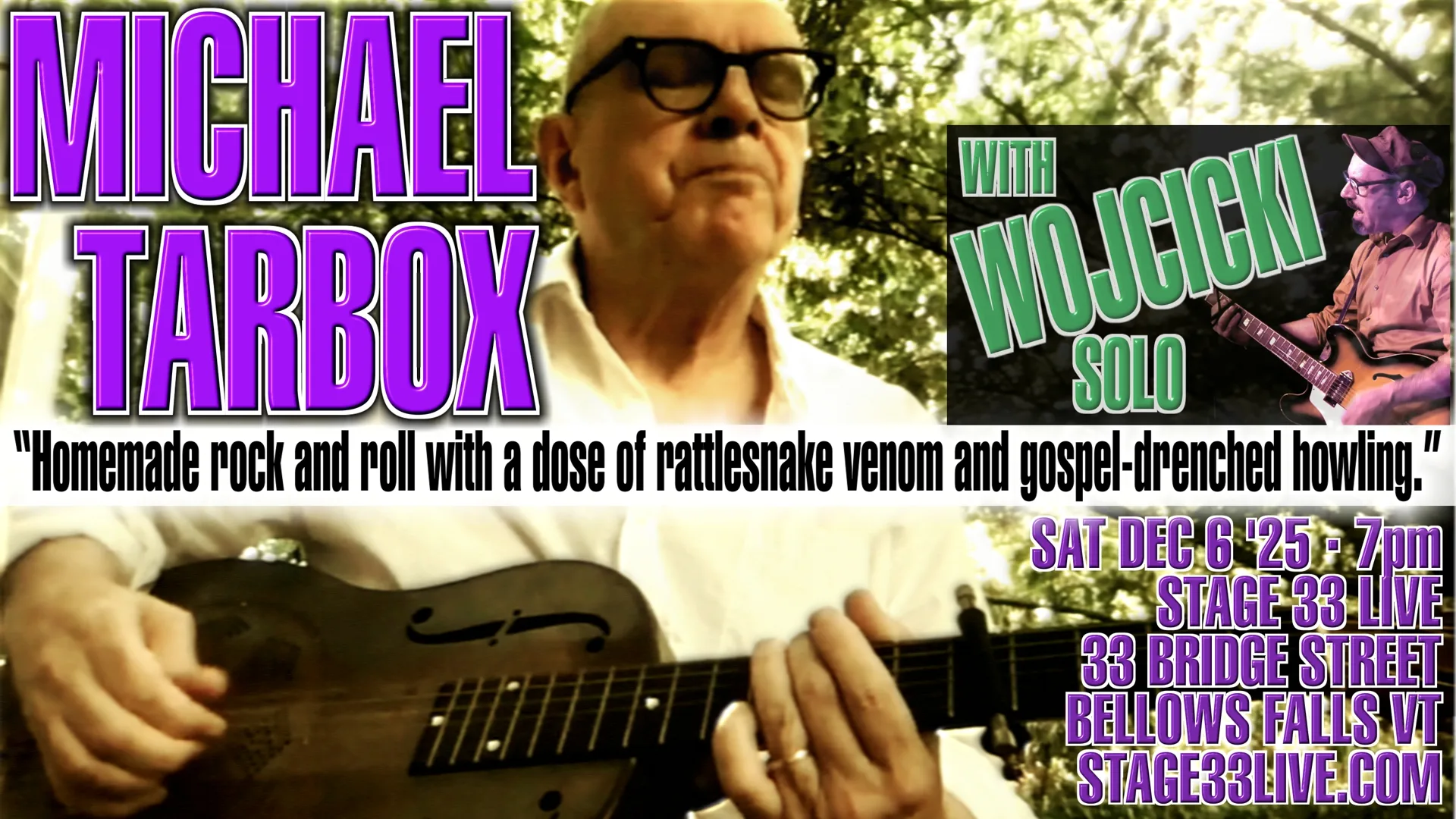 Michael Tarbox and Wojcicki (solo) at Stage 33 LiveMichael Tarbox writes songs anchored in rock ânâ roll, backwater blues, hillbilly music, and country â rough-hewn, immediate, and hard-won. The Chicago Reader calls his singing âageless.â His…